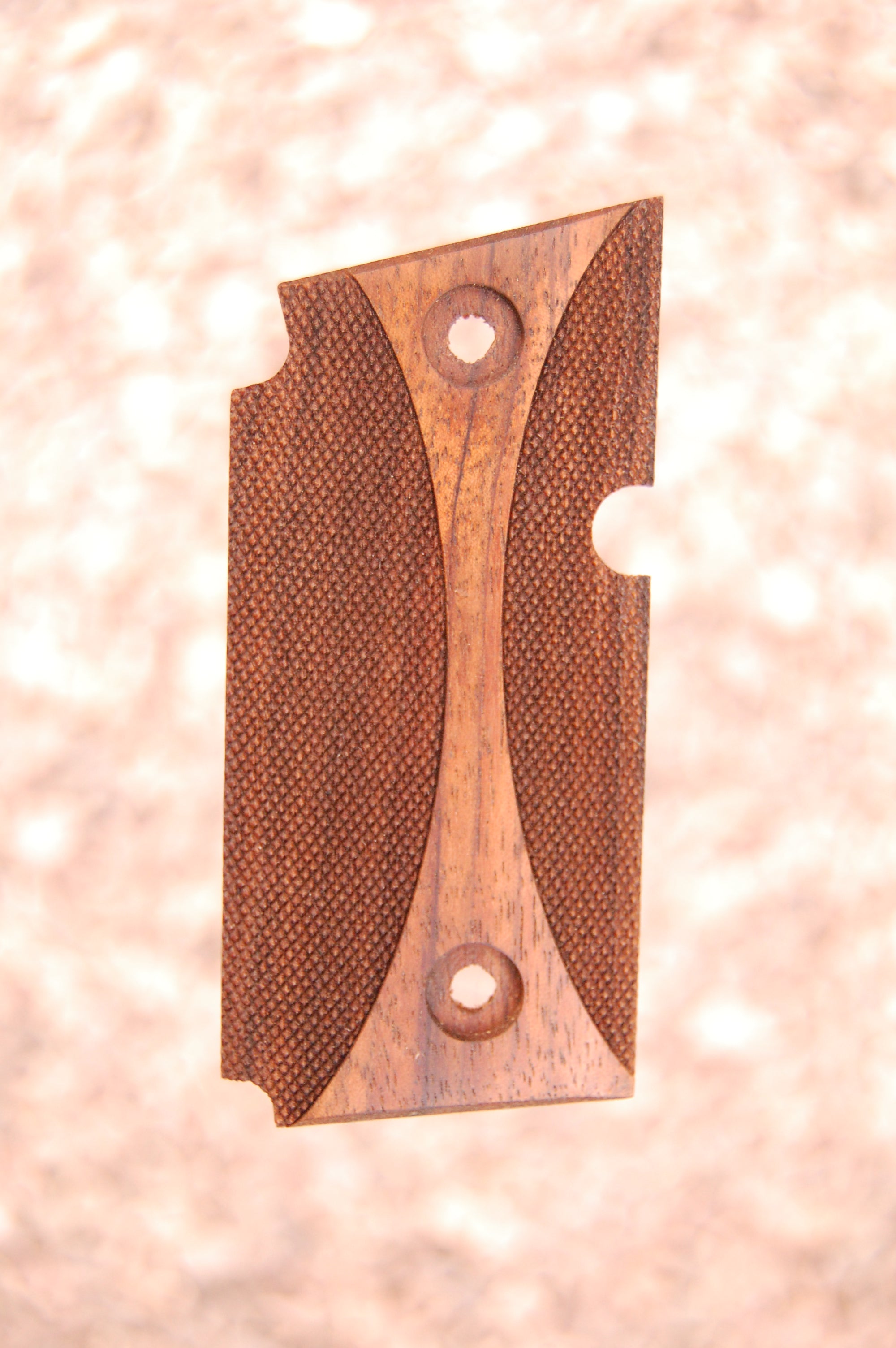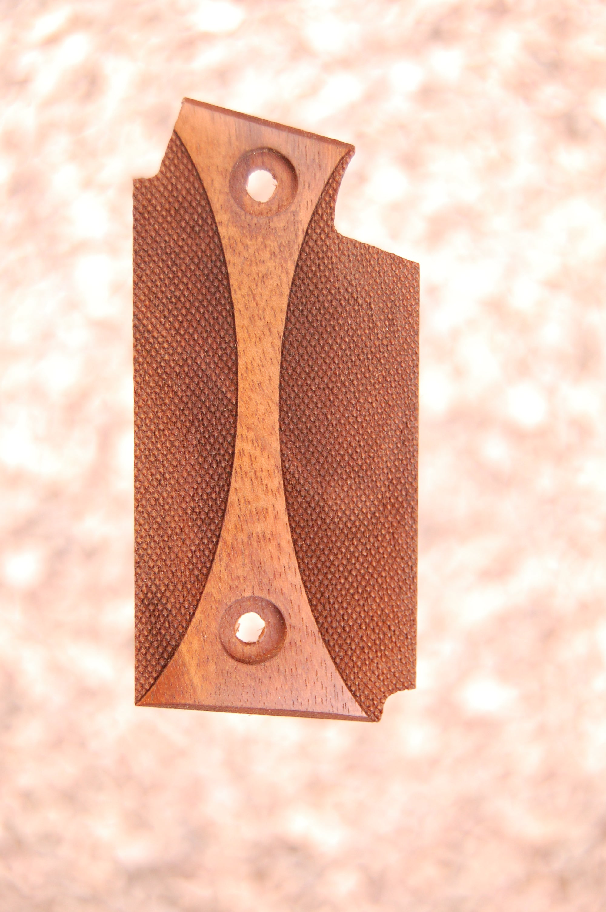 The grips are carved out of naturally dried English or French walnut. We do not stain our grips, therefore each grip is unique in color and grain. Both panels are finely checkered. To protect the surface of each grip, it is treated with a special mix of natural oils.
